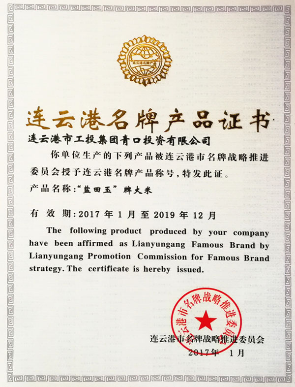 ? ? ? ? 近日,我公司“鹽田玉”品牌大米經(jīng)過連云港市名牌戰(zhàn)略推進(jìn)委員會審議,被授予2017-2019年度“連云港名牌”稱號。這是米業(yè)營銷中心對“鹽田玉”品牌創(chuàng)建的又一重大突破,也為下一步大米營銷工作打下堅實(shí)的品牌基礎(chǔ)。(王踴)