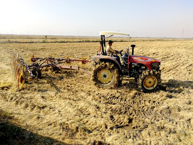 為有效防止秸稈焚燒形成的污染,保護生態(tài)環(huán)境,促進秸稈綜合利用。日前,大新農(nóng)場在水稻收割的同時積極聯(lián)系秸稈回收廠家,對水稻秸稈進行回收打包。稻田里,帶有八個圓形大齒輪的水稻摟草機正在工作,機器行駛在收割完的稻田中,將聚攏后的秸稈進行打捆作業(yè),所過之處水稻秸稈被卷起,變成從機械后面“吐”出的一個個圓形稻草捆。通過秸稈回收,將大大降低秸稈焚燒安全隱患和環(huán)境污染問題。 (大新農(nóng)場