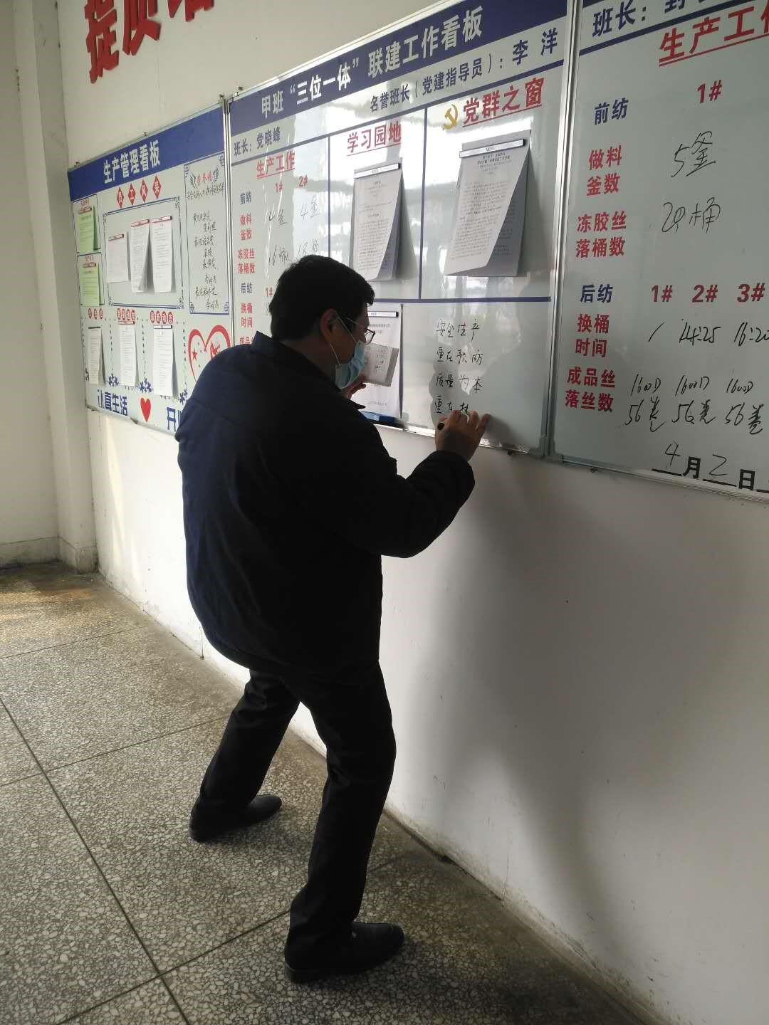 圖為生產(chǎn)設(shè)備部副部長(zhǎng)王勇為甲班書(shū)寫(xiě)班組口號(hào)。