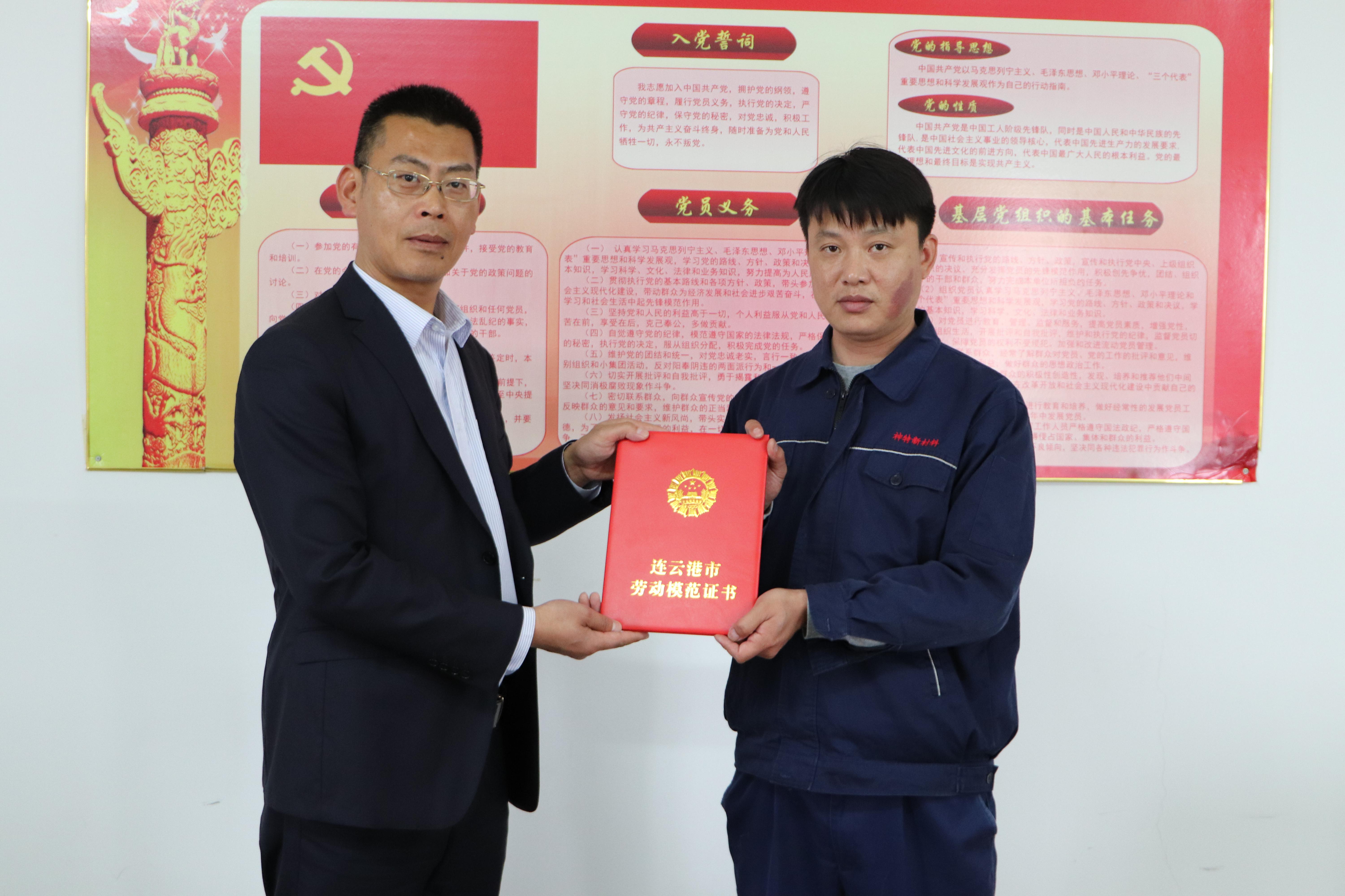 近日,我公司員工封安獲得連云港市勞動模范殊榮。封安同志現(xiàn)為公司生產(chǎn)車間甲班大班長。他,九載如一日,始終保持著執(zhí)著、敬業(yè)和精益求精的精神,在平凡的崗位上做出不平凡的業(yè)績,詮釋了新時代工匠精神,展示了勞動者模范風(fēng)采,成為一線工人的杰出代表。
