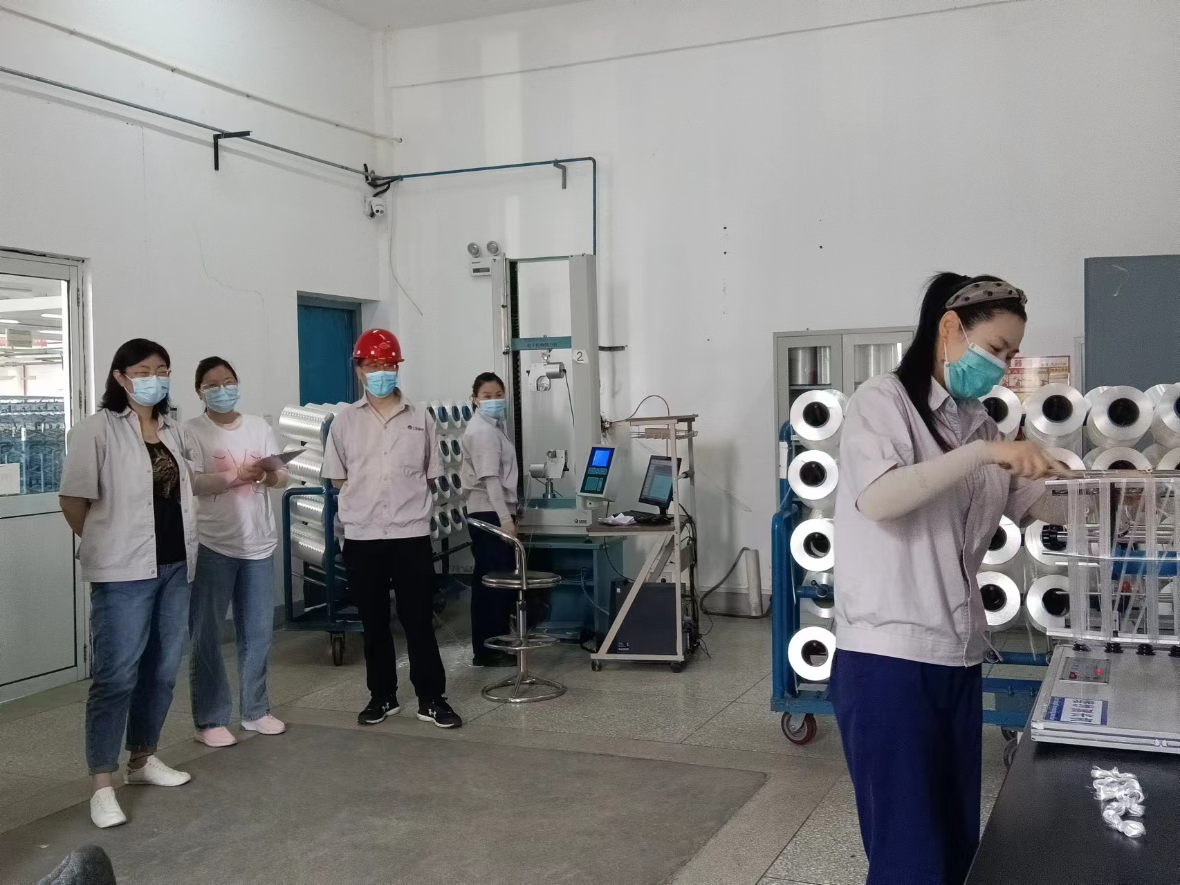 上午9:30,物檢班組緊接著開始比賽。纖度檢測(cè)首先上場(chǎng)的是王玉梅同志,掛絲、繞絲、打結(jié)、稱重有條不紊的完成了比賽。強(qiáng)度檢測(cè)比賽中侯義芹同志第一個(gè)出場(chǎng),以幾乎完美的表現(xiàn)完成了比賽。經(jīng)過激烈的角逐,王娟同志以4分10秒05獲得了纖度檢測(cè)第一名,侯義芹同志1分51秒14獲得強(qiáng)度檢測(cè)第一名 。