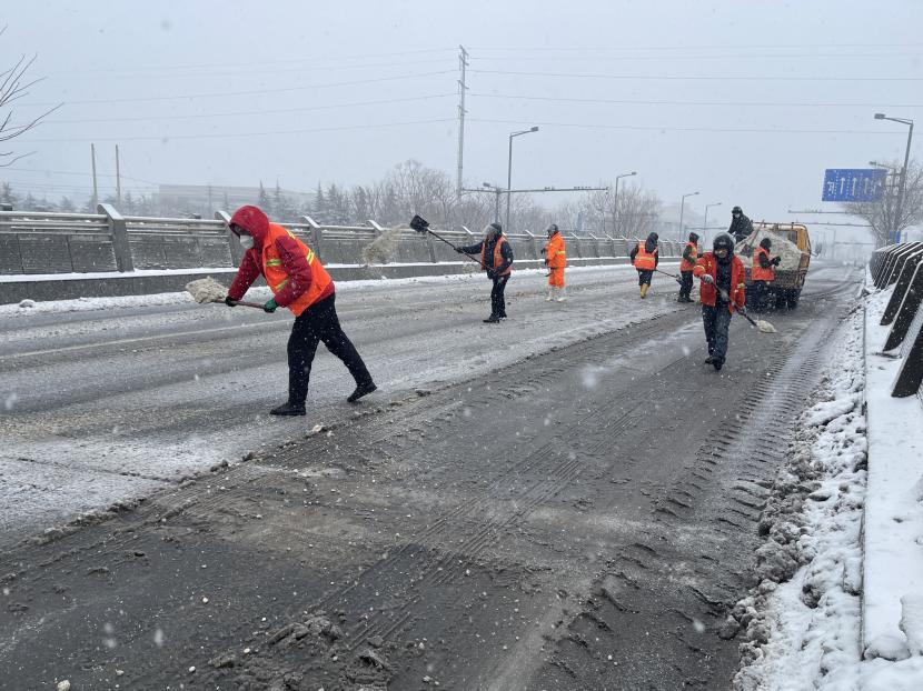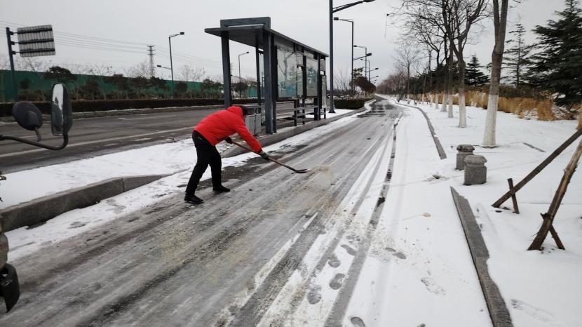 “融雪劑拋灑的時(shí)候要均勻拋灑,不要成團(tuán)堆積,這樣不僅融雪的效果不好,還會浪費(fèi)物資?!鳖A(yù)備黨員武新忠一邊說著,一邊示范著給其他隊(duì)員。哪里的積雪最厚,哪里就有他們揮鍬鏟雪的身影。在融雪劑不能及時(shí)送達(dá)的情況下,他們就使用人工除雪的方式,不斷檔、不離線、不缺位的清除路面積雪,保證路面不出現(xiàn)積雪狀況。為堅(jiān)決完成上級“雪停路凈”的掃雪除冰任務(wù),他們不畏嚴(yán)寒,冒著風(fēng)雨冰雪,晝夜不停,連續(xù)三天奮戰(zhàn)在掃雪的一線!以雪為令,雪不停,掃雪不止,一直堅(jiān)守在掃雪工作中,有效清除了區(qū)域內(nèi)的積雪,確保了交通道路的安全暢行。