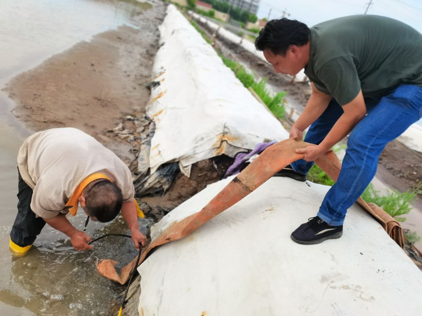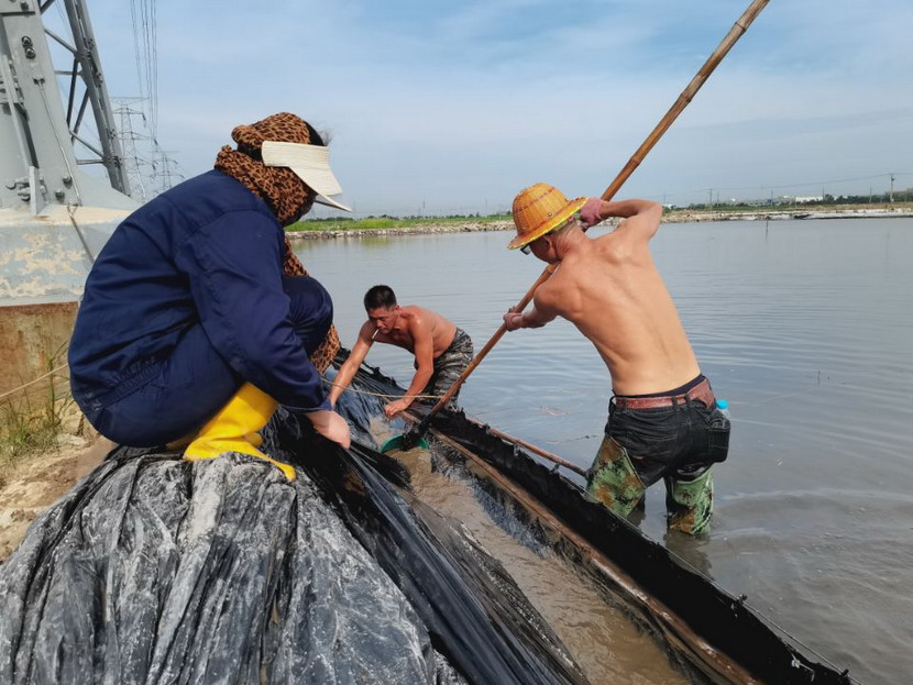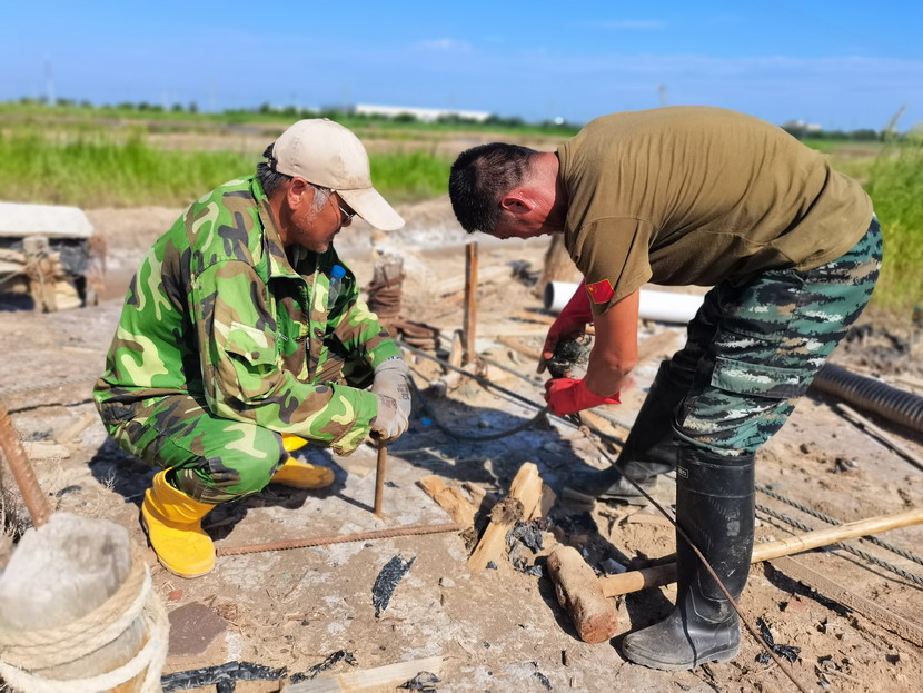 來到海州灣公司灘頭,遠(yuǎn)遠(yuǎn)望見幾名職工在鹽池里勞作,走近一看,組長(zhǎng)夏軍正帶領(lǐng)一組人整修塑苫池。“我們5點(diǎn)就出來了,趁早涼,趕緊把塑料布整理一下,布子上都是鹵,長(zhǎng)了鹽就不好處理了,搞不好這鹵水還會(huì)淌到外面去,造成浪費(fèi)......”邊說著邊用肩膀頭子蹭一下眼角的汗水,手里的活一直沒停。據(jù)了解,海州灣公司承接臺(tái)北礦鹽和鈣液兩大產(chǎn)業(yè),經(jīng)濟(jì)比重占全公司收入60-70%,當(dāng)前雖然是高溫期,但是廣大職工搶抓汛期難得的晴好天時(shí),每天清晨5點(diǎn)就在灘地上忙碌起來,汗水模糊了雙眼,額頭的汗水順著帽檐往下滴落,身上的衣服一直都是濕漉漉的,緊貼在身上,即便如此,他們也毫不在意,用他們的話:“看著池子里每時(shí)每刻都在落鹽,這點(diǎn)汗就沒白淌啊!”我們臨走的時(shí)候,夏軍還不忘說:“今年我們保證鹽量突破2萬噸,不虧損。”