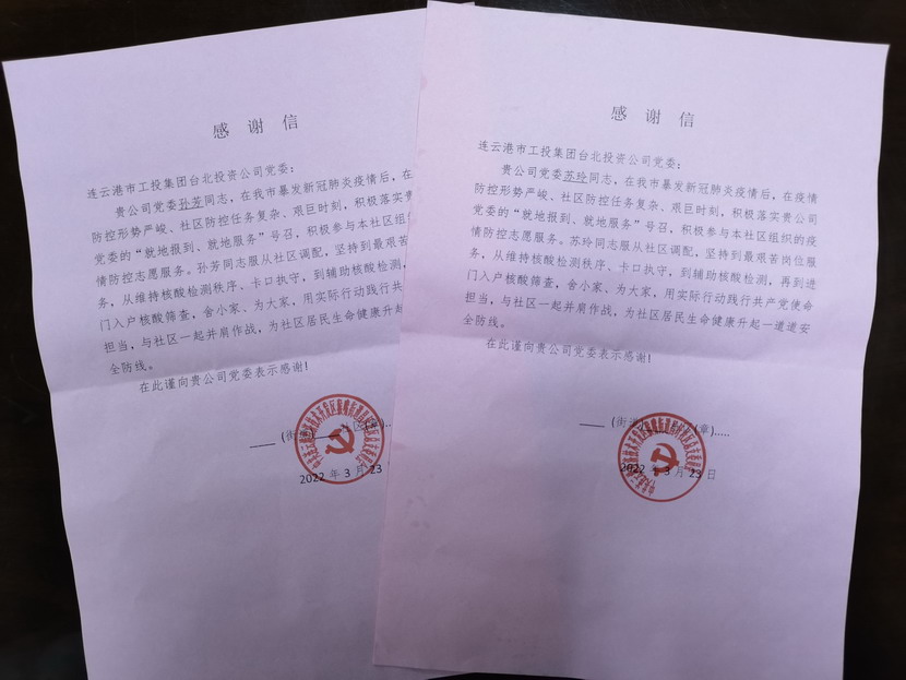 “臺北投資公司的黨員同志們視疫情防控為己任,服從調(diào)度安排,站好每一班崗,不僅認真履行防控職責,又創(chuàng)新開展疫情防控教育宣傳、便民服務(wù)等多項活動,成為我們社區(qū)防疫攻堅的主力軍。”325日,收到開發(fā)區(qū)猴嘴街道昌圩社區(qū)送來的一份特殊的“禮物”— 一封疫情防控感謝信,感謝臺北投資公司黨員蘇玲、孫芳等同志在新冠肺炎疫情防控的關(guān)鍵階段挺身而出、伸出援手,參與協(xié)助社區(qū)的疫情防控工作。