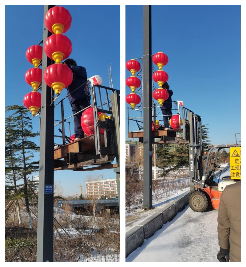 “亮華港城”。近期的一場大雪不僅給港城披上一件銀裝,也將花果山大道兩旁的路燈和燈籠刮落損壞。翔立鐵軍放棄休息奮戰(zhàn)在修復燈籠工程一線,保障了人民群眾的出行安全。