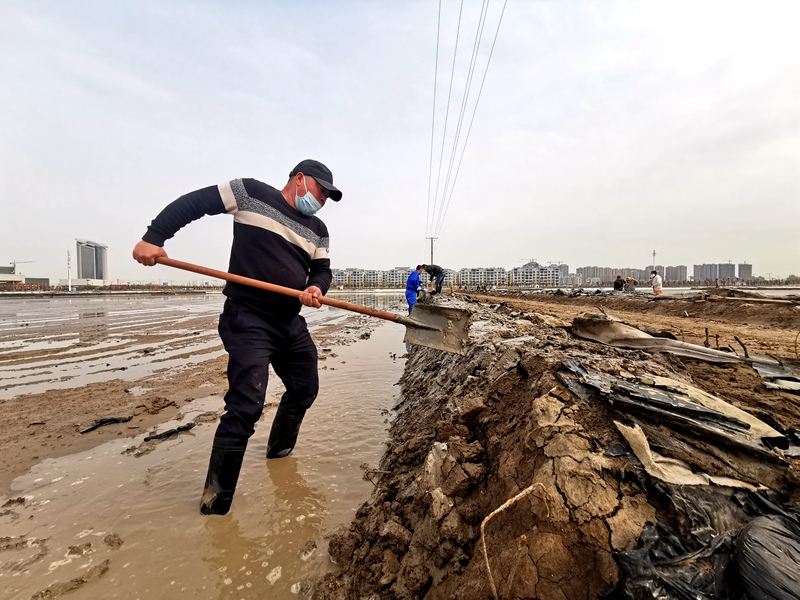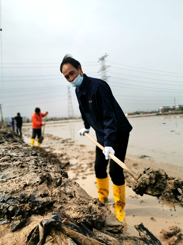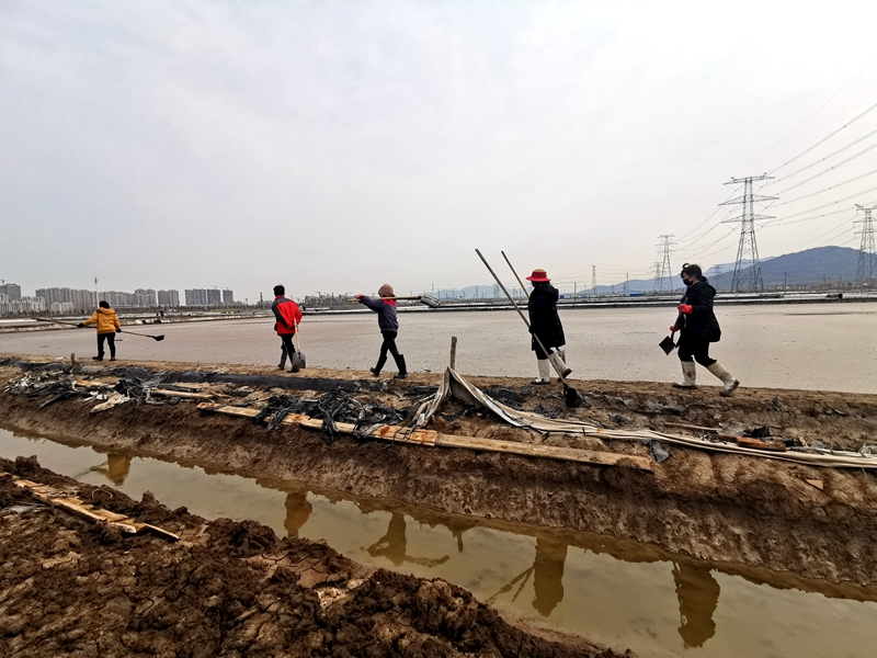 往東邊看,先鋒東灘黨旗招展分外鮮紅,海州灣公司18個(gè)單元職工、3名班組長(zhǎng)全員出動(dòng)馳援大浦工區(qū)協(xié)同重整410畝閑置鈣鹽灘地。引水入溝、翻泥上堰、腳踩和整、鐵掀蹋平,動(dòng)作嫻熟。1200余米的10余條池堰僅用一天的就順利完工。
