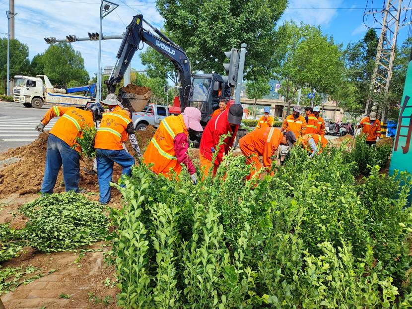 面對時間緊、任務(wù)重的挑戰(zhàn),黨支部迅速將黨員突擊隊劃分“栽植組”“運輸組”“后勤保障組”三個小組?;顒蝇F(xiàn)場,黨旗迎風(fēng)飄揚(yáng)。黨員們干勁十足,揮鍬挖坑、搬運苗木、覆土定根,各個環(huán)節(jié)井然有序。運輸組黨員不畏酷暑,駕駛?cè)嗆囃缔D(zhuǎn)運大葉黃楊苗;栽植組兩人成對,精準(zhǔn)把控株距和深度;后勤保障組及時調(diào)配物資、貼心提供飲水防暑用品,全程做好協(xié)調(diào)支持。經(jīng)過連續(xù)12小時奮戰(zhàn),35000余株苗木整齊挺立,原本裸露的地段及缺口區(qū)域煥發(fā)新生。