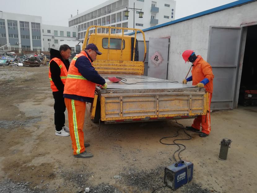 1月9日上午,經(jīng)過該公司設(shè)備維修班組再三斟酌,考慮如送修理廠維修,不但產(chǎn)生一筆不小的維修費用,而且等待維修過程時間較長,影響工作進度,為能給公司節(jié)省開支和不影響工作進度,維修人員量好車廂底板尺寸后,將鐵板切割出需要的尺寸,一塊塊拼湊起來,加固在車廂底板上,通過半天的時間,順利為工具車底板披上一層合身、漂亮又特別的“盔甲”,有效延續(xù)了它的使用壽命。
