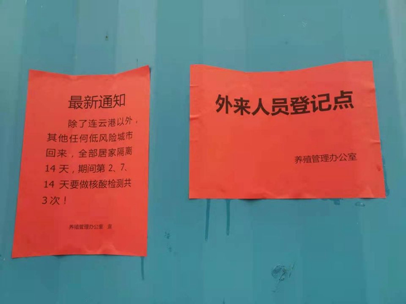 養(yǎng)殖管理辦公室迅速反應(yīng),成立防疫領(lǐng)導(dǎo)小組,加強值班值守,設(shè)置疫情防控設(shè)置隔離點、外來人員登記點,張貼疫情動態(tài)通知。養(yǎng)殖辦全員到“塘頭”排查是否有人員與中高風(fēng)險地區(qū)回連人員的接觸史(包括家人和周邊鄰居)和疫苗接種情況;對來往車輛和人員進行逐一登記排查,宣傳防疫注意事項;并要求養(yǎng)殖戶不得雇傭除了連云港以外人員干活、不得讓除了連云港以外人員或車輛在池塘進出。