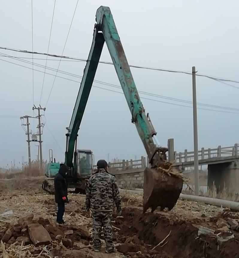 難!難!難!有困難才具有挑戰(zhàn),在“四拼”前一切困難皆為“紙老虎”,大家及時將壓力變?yōu)閯恿?。確定方案后,立即分頭行動,一切工作按部就班,購買8米木樁,河岸邊專人指揮長臂挖掘機機械打樁,頭頂高壓線與通信線路相互交織,現(xiàn)場安全員全過程監(jiān)督指揮保障施工安全距離緊張施工,利用簡易泡沫筏人工敲開河面冰層,劃到河心鉆孔安裝木橫擔(dān),人工開挖河對岸管道,切割吊取管道,打磨涂覆,一切都在有條不紊的進行中。考慮到玻璃鋼管道的易碎性,不敢使用挖掘機吊裝,只能全人工小心翼翼的一小段一小段的輕抬慢放,慢慢挪到門型橫擔(dān)上緩緩過河,捆綁固定,最后是對口纏裹涂覆回填竣工。
