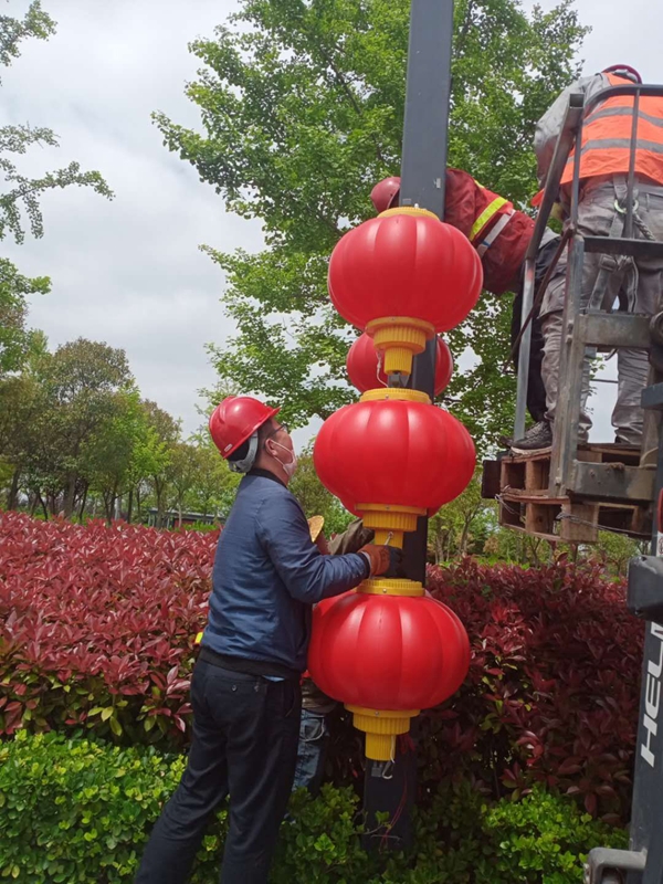 施工現(xiàn)場大家配合默契利用小型叉車進行輔助拆除作業(yè),五分鐘不用一個燈籠就拆除完成。這邊完成拆除部分,那邊負責還原以及運送回收。由于燈籠的不可收攏,同時為避免造成二次污染,對于拆下來的燈籠及時進行運送回收保存,確保第二年要安裝的時候重復(fù)利用。
