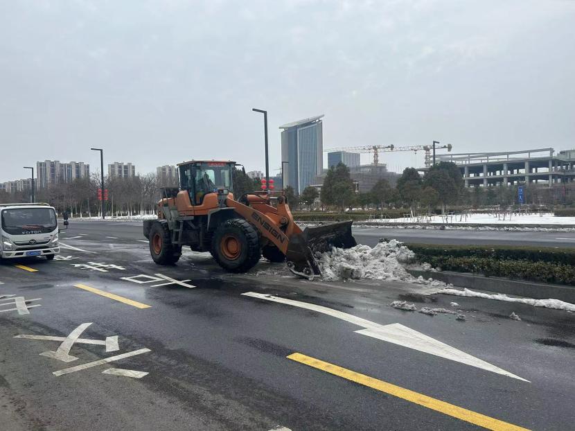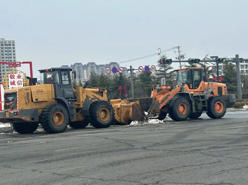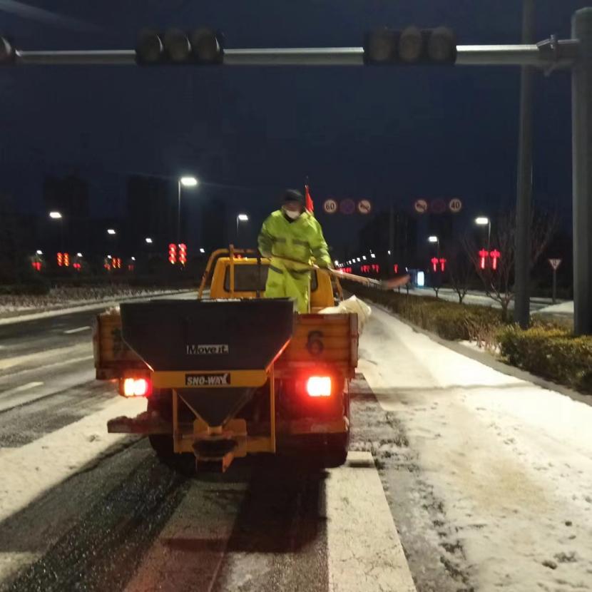 ? ? 一方有難,八方支援。由于本次降雪量大、勢急、持久,單靠環(huán)衛(wèi)分公司無法全面完成任務(wù),在上級領(lǐng)導(dǎo)的統(tǒng)籌考慮下,兄弟單位火速馳援,大綠化、大市政、大采購,大的不僅是業(yè)務(wù)整合,更是人心凝聚,更是集思廣益。翔立、盛達(dá)利用鈣液和工程資源優(yōu)勢,通過架設(shè)大型原料桶儲備鈣液水,由3-5輛工具車進行24小時鈣液拋灑,積冰融化速度超出預(yù)期,提升了后期鏟車的工作效率,順利保證了上下班高峰期交通順暢。特別是在222日,在兄弟單位的協(xié)助下在清晨8點完成了活動路線保障及市領(lǐng)導(dǎo)掃雪除冰視察。
