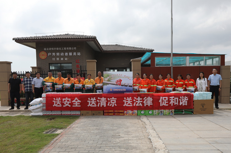 ????? 84日上午,市總工會副主席王悅到連云港綠化工程公司基層班組開展“送安全、送清涼、送法律”活動(dòng),走訪慰問堅(jiān)守在高溫作業(yè)現(xiàn)場的市政養(yǎng)護(hù)職工,在送去防暑藥品、涼茶、礦泉水、綠豆、白糖、毛巾等防暑降溫物品的同時(shí),為他們送去絲絲涼意誠摯的關(guān)懷。
