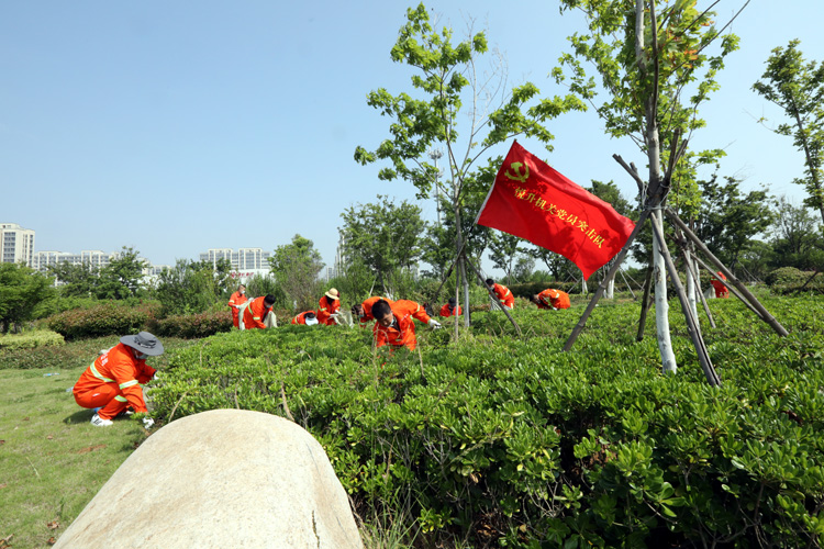 活動分為四組進(jìn)行,四組黨員突擊隊跟隨引導(dǎo)員的腳步到達(dá)各自片區(qū),進(jìn)行綠化帶雜草清除作業(yè)。在各組支部書記的帶領(lǐng)下,勞動中人人做表率,個個干勁足,有條不紊互相配合,一抹抹橘色在清新草色的襯托下格外美麗。