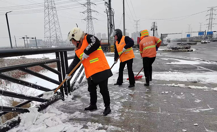 在白雪皚皚的雪地里,身穿橘黃工作服的保潔工人就是最美的點綴,他們頂著風(fēng)雪吹打臉頰,兩人一組、三人一對,配合默契,揮動手中鐵銑,用力拋灑融雪鹽斤80多噸,10余車。道路橋粱兩側(cè),人行輔道邊上,公司上下齊心協(xié)力,9名班長在公司統(tǒng)一調(diào)配下,帶領(lǐng)班組人員,人工清除大小橋梁兩側(cè)積雪30多座,人行輔道長達3000多米長,站臺、叉路口積雪100多處,為保障恢復(fù)雪后新城環(huán)境整潔而努力工作。大型清掃設(shè)備駕駛員全員齊上陣,安全行車裝運融雪鹽斤里程達200多公里,工作時長10個多小時,安全操作鋤雪機械清理張圩互通引橋,埒子口大橋等路段長達5000多米長,有力彰顯機械破冰、除雪強大功能。(楊波)
