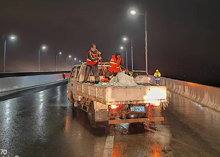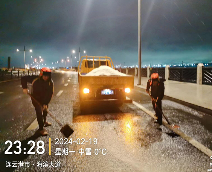 該公司迅速啟動(dòng)突發(fā)天氣應(yīng)急保障預(yù)案,近30余名道路應(yīng)急排險(xiǎn)突擊隊(duì)員,在公司統(tǒng)一按排下 ,裝車備運(yùn)融雪鹽斤近15噸,現(xiàn)場(chǎng)工作中隊(duì)員們士氣高漲,無(wú)所畏懼。夜間8時(shí)左右,10余名黨員先鋒,兵分三路再次安全有序奔赴燒香河、海濱大道、228等路段橋梁,無(wú)懼大風(fēng)夾著冰雨顆粒吹打臉頰,兩人一對(duì)、三人一組、揮動(dòng)手中鐵銑,汗水與冰雨濕透橙色衣衫,經(jīng)過近4個(gè)多小時(shí)努力奮戰(zhàn),人工撒放融雪鹽斤近20余噸,高質(zhì)高效保障近30座橋梁安全通暢。