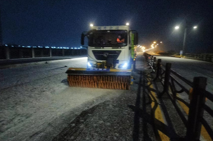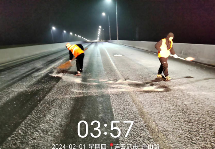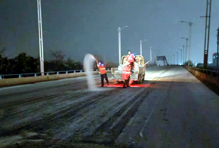 截止早上7點(diǎn),悅升公司共出動(dòng)機(jī)械設(shè)備10臺、人員260余人,對橋梁和重點(diǎn)結(jié)冰地段使用融雪劑150余噸,及時(shí)消除路面冰凍隱患100余處。