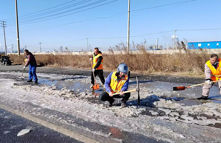 近期由于受冷空氣影響,氣溫低下,園區(qū)道路低洼積水處產(chǎn)生大面積結(jié)冰現(xiàn)象,如不及時(shí)清除,嚴(yán)重造成車輛側(cè)翻事故發(fā)生。道路排查現(xiàn)場(chǎng),管理人員及時(shí)與園區(qū)二班對(duì)接,聯(lián)合開展“破冰保暢通”突擊活動(dòng)。大家各負(fù)其責(zé),齊心協(xié)力,揮動(dòng)手中鐵銑、羊鎬,經(jīng)過(guò)近4個(gè)多小時(shí)共同奮戰(zhàn),撬動(dòng)冰塊近400多塊,清理積水300多平方、20多處。