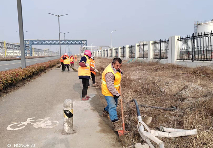 該分公司注重細節(jié),不斷強化突擊治理成效,第一時間策劃保潔方案。園區(qū)兩個班組35名保潔員工在公司統(tǒng)一指揮下,步調(diào)一致,無懼三九嚴寒低溫天氣,兩人一對,三人一組,舞動掃把,清掃輔道泥土雜草;勞動現(xiàn)場,黨員先鋒無處不在,石峰、朱海勇、楊靜等同志,身背幾十斤重打草機械,盡管汗水浸濕橙色衣衫,累得腰酸背痛,無所怨言,仍然擺動雙臂,經(jīng)過近三天的努力奮戰(zhàn),收割石化三道、十道、復堆河路牙,輔道雜草3000多米長,清理管廊、取水點隱藏各類白色垃圾400多包,轉(zhuǎn)運20余車,人工清掃路面2000多米長。
