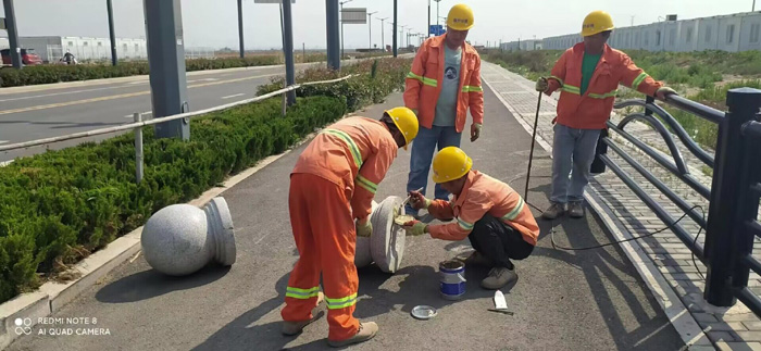 維修班組成員經(jīng)過多日實地考察,結合道路現(xiàn)場實際情況制定了維修計劃,并對部分道路上擋車樁點位、間距設置進行了合理調(diào)整,來規(guī)避擦碰現(xiàn)象發(fā)生。在石化三路一處施工現(xiàn)場,兩組隊員頂著炎炎烈日正在非機動車道上進行擋車柱安裝工作,他們配合默契,利用開孔鉆、鐵锨等工具開孔、清掏、埋設樁柱,然后用混凝土填充、壓實地下部分,最后整平路面。安裝好之后將有效阻止機動車隨意占用人行通道,達到安全目的。本次施工共安裝維修擋車柱36個、穩(wěn)固球狀擋車石約180多處。