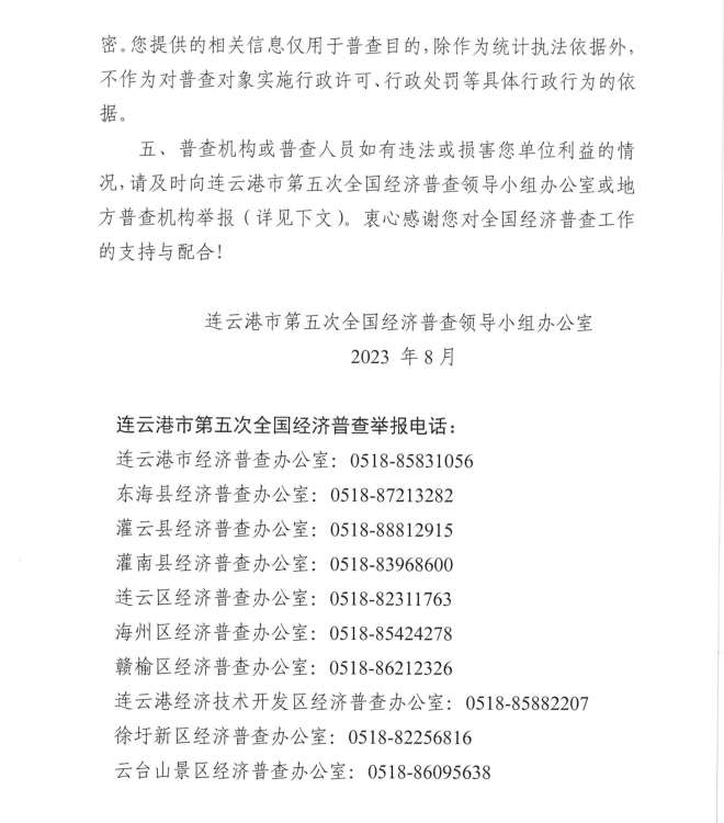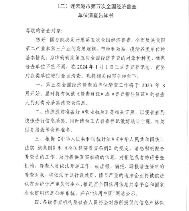 按照《全國經(jīng)濟(jì)普查條例》規(guī)定,國務(wù)院決定于2023年開展第五次全國經(jīng)濟(jì)普查,為提高經(jīng)濟(jì)普查質(zhì)量,進(jìn)一步推進(jìn)普查工作順利開展,公司按照上級(jí)第五次全國經(jīng)濟(jì)普查宣傳動(dòng)員工作要求,現(xiàn)將《連云港市第五次全國經(jīng)濟(jì)普查單位告知書》公示如下: